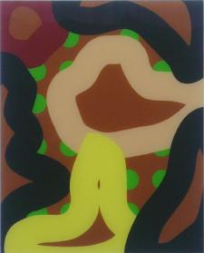 um Hinterglas-Malerei – mit jazzig beschwingten Rythmen, verbirgt sich eine Anmutung, als würden Worte heftig ineinander verschlungen und verknotet schweigend gesungen. Wellenförmig organografische Farblinien überlagern,