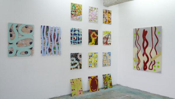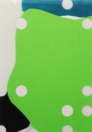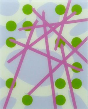 wie hochgezoomte Ausschnitte aus mechanischen Schreibversuchen, oder aus Grafitti´s die immer in Brailleschrift angeordneten Farbpunkte, die seriell in allen Bildern dieser Gruppe den Begriff „text“ anzeigen. Die Andeutung der Blindenschrift, die hier ausschließlich als Farbkreise und nicht mehr haptisch erfahrbar gezeigt werden, machen den Sehenden auf die potenzielle Möglich-keit des Nichtsehens aufmerksam, um gleichsam das Sehen zu verstärken. Die Strichführung scheint in nicht endenwollender Bewegung zu sein, nur die Punkte lagern sich streng in durchbrochenem Raster zwischen die Ebenen.