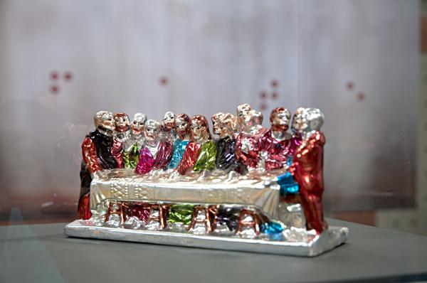Und zugleich werden die Betrachtenden inmitten der in den Kirchen hängenden Tücher auch Teil einer großen raumgreifenden Installation werden. Die „Gesichter“ sind „in Wahrheit“ verfremdete Fotografien einer verkitschten und erkennbar „gefaketen“ Abendmahlsdarstellung aus Glas, die ihrerseits auf die Abendmahlsdarstellung von da Vinci verweist.