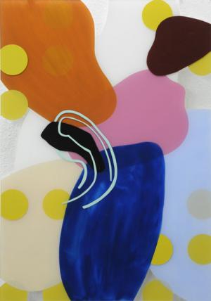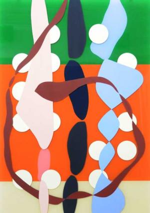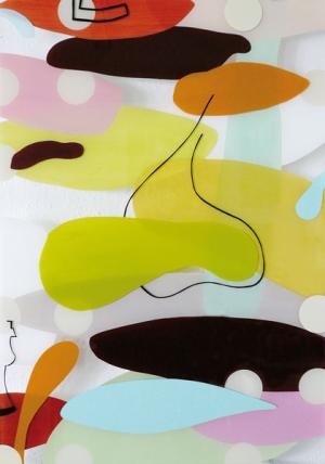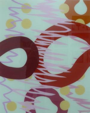 um Hinterglas-Malerei – mit jazzig beschwingten Rythmen, verbirgt sich eine Anmutung, als würden Worte heftig ineinander verschlungen und verknotet schweigend gesungen. Wellenförmig organografische Farblinien überlagern,