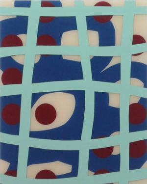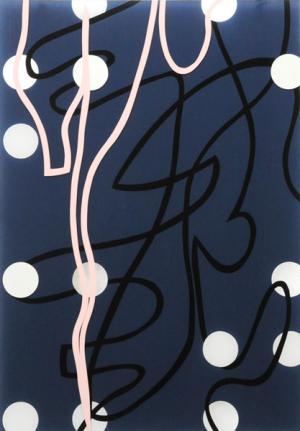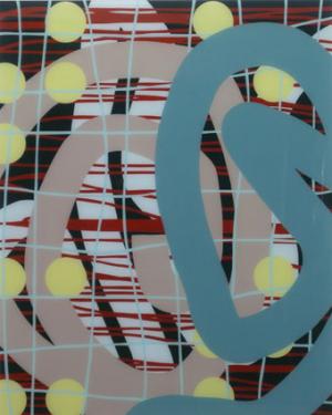 wie hochgezoomte Ausschnitte aus mechanischen Schreibversuchen, oder aus Grafitti´s die immer in Brailleschrift angeordneten Farbpunkte, die seriell in allen Bildern dieser Gruppe den Begriff „text“ anzeigen. Die Andeutung der Blindenschrift, die hier ausschließlich als Farbkreise und nicht mehr haptisch erfahrbar gezeigt werden, machen den Sehenden auf die potenzielle Möglich-keit des Nichtsehens aufmerksam, um gleichsam das Sehen zu verstärken. Die Strichführung scheint in nicht endenwollender Bewegung zu sein, nur die Punkte lagern sich streng in durchbrochenem Raster zwischen die Ebenen.
